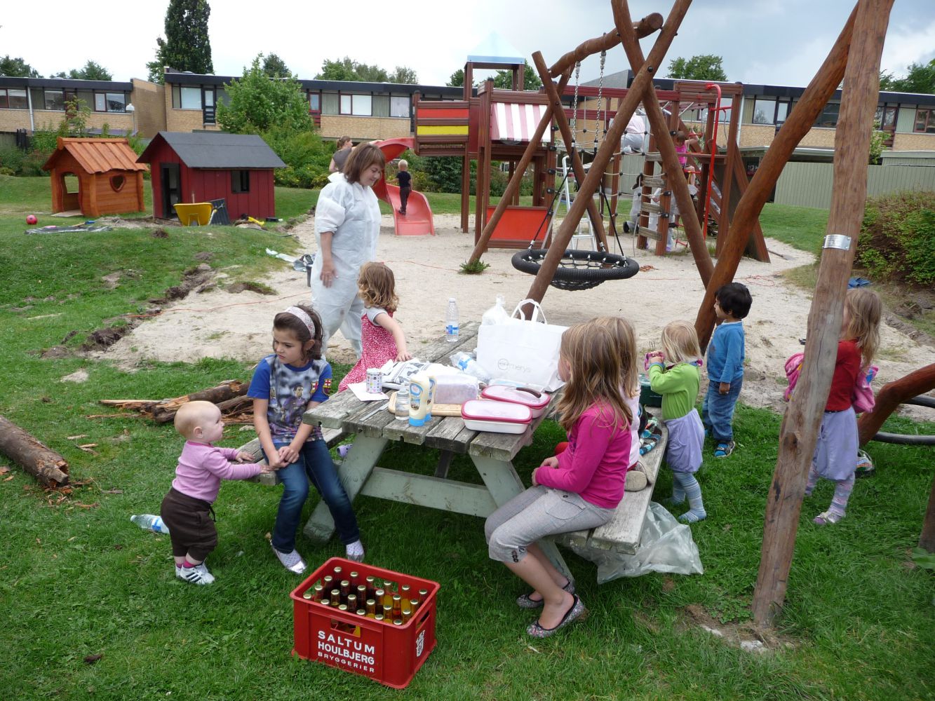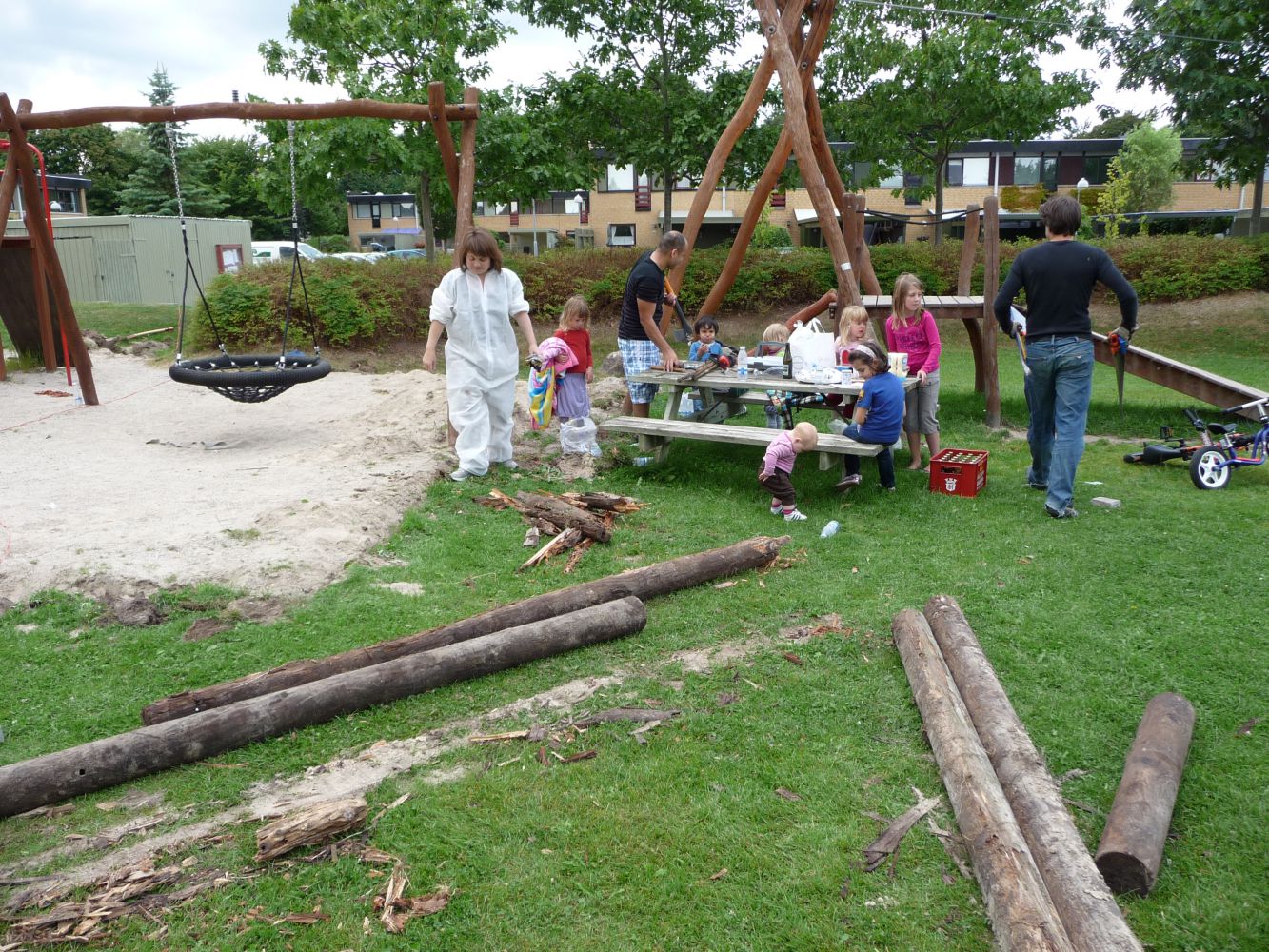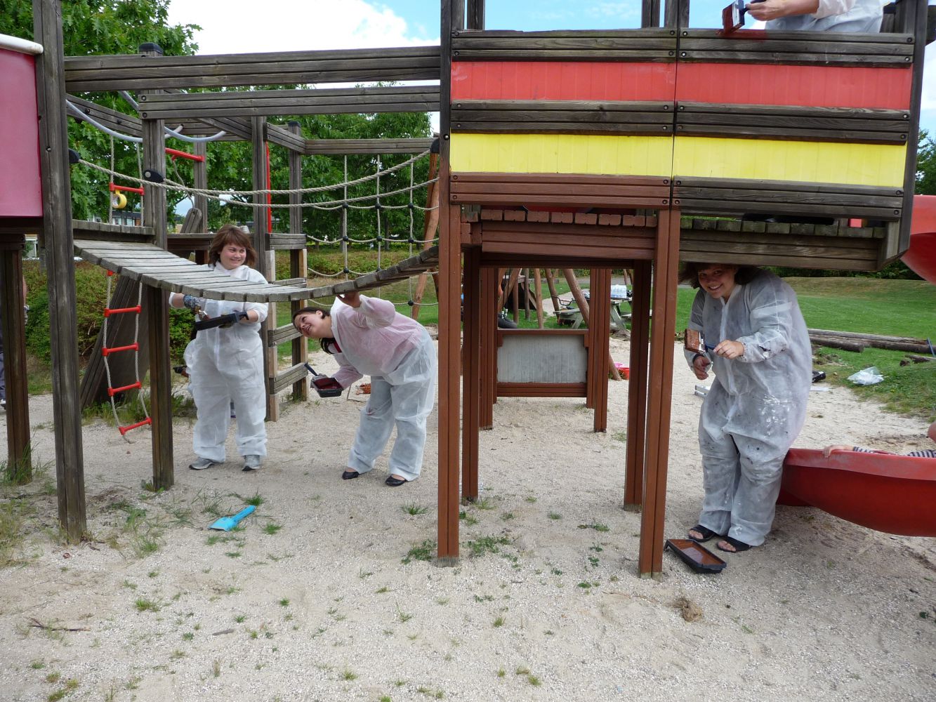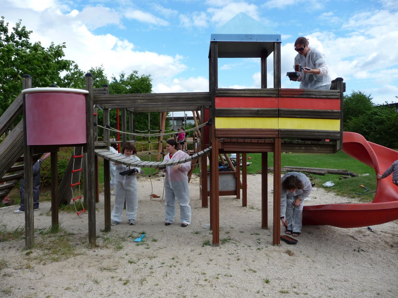 - Algebehandling samt træbeskyttelse med olielasur på svævebanen, legehusene, balancebanen og de to gyngestativer (Tørretid 1 uge – dvs. legeredskaberne kan tages i brug igen den 22. juni).